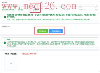 报考信息填写完成后,系统将跳转至【上传材料】页,考生也可点击报考流程中的【上传材料】节点进入上传材料页面。考生可先点击“打印报名表”,下载并打印报名申请表,然后按照考区的要求上传相关证明材料。