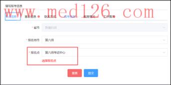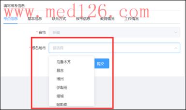 4.按顺序填写报名信息,每页填写完毕后点击当页的“提交”按钮进入下一页填写,标“*”的为必填项。(1)下拉选择“报名地市”。