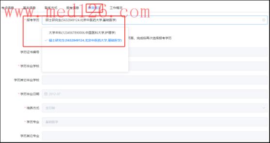 (5)填写教育情况,点击“报考学历”后会显示在注册过程中对【学历学位信息维护】的相关内容,可直接引用其中对应的学历信息。