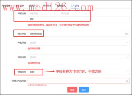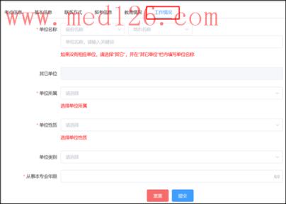 (6)填写工作情况,包括“单位名称”、“单位所属”、“单位性质”、“单位类别”和“从事本专业年限”。