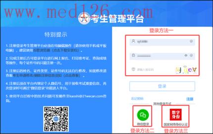 一、报名流程(一)登录考生管理平台方法一:输入用户名或证件号码+密码登录。方法二:使用绑定的微信扫码登录。方法三:使用国家网络身份认证登录。