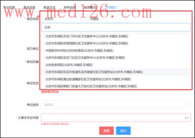 填写“单位名称”时可先选择省市,再输入关键字(不可输入单位缩写、简称)检索单位名称,并在下拉列表中选择相应单位。